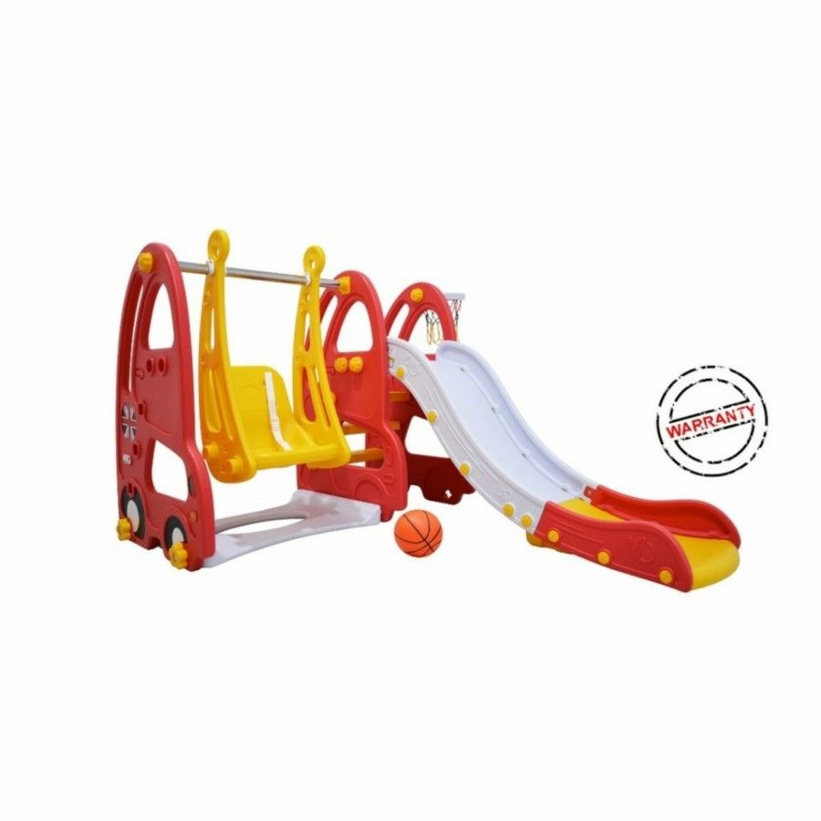 London Bus Slide and Swing Red dilengkapi panel pengaman pinggiran dikedua sisinya, papan landasan untuk mendarat lebih halus dan pondasi yang kokoh.
