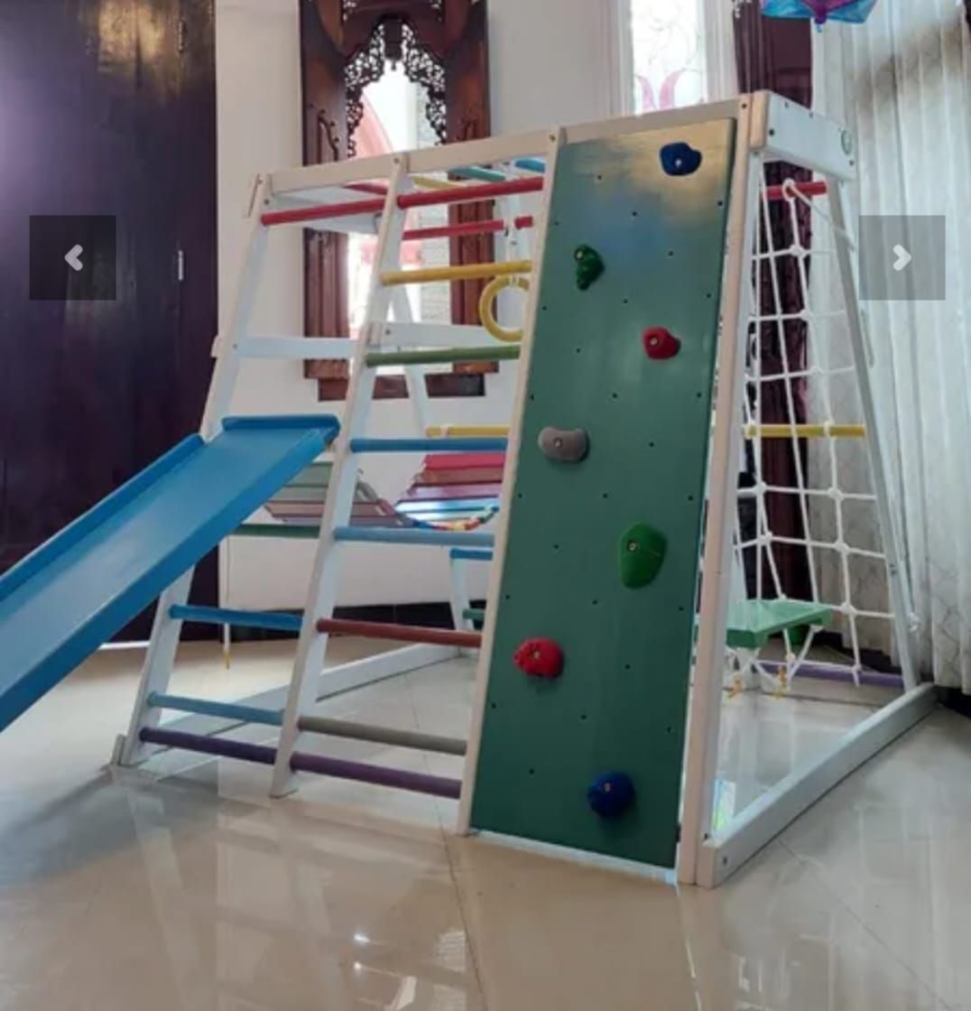 Fitur : Wall Climbing, ladder, rope ladder, monkey bar, spider web, gym ring, standar wing, jembatan, slide dua sisi bolak balik dengan pijakan kaki